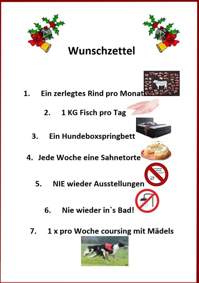 Ein letztes Mal in diesem Jahr schreibe ich ein paar Zeilen auf diese Seite! In ein paar Stunden gehört sie der Vergangenkeit an. Vieles, was wir uns im letzten Jahr an genau dieser Stelle gewünscht haben, ging nicht in Erfüllung! Doch Vieles, was wir gar nicht erwartet haben, trat ein, im Guten wie im Schlechten! Wir z. B. blicken in großer Dankbarkeit auf unsere Familie! Alle sind noch da, allen geht es gut! Uns auch! Wir leben noch alle, und das gar nicht so schlecht! Das führe ich mir persönlich, angesichts der Katastrophen um uns herum, immer wieder vor Augen! Und das erfüllt mich mit Dank und Demut! Und wie es sonst im Leben so ist: Türen schlugen zu, andere, viel bessere, öffneten sich! Und so wünschen wir allen ein frohes, friedfertiges Neues Jahr 2024! Die "Barsois zu Elben Äiken" mit Hanna und Achim!