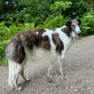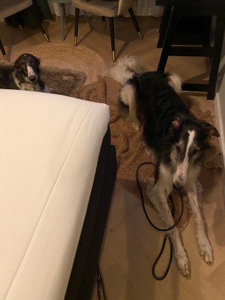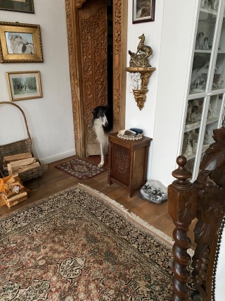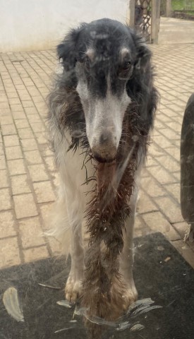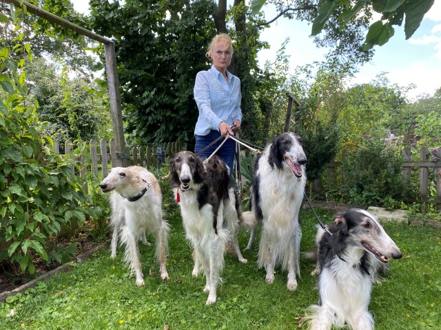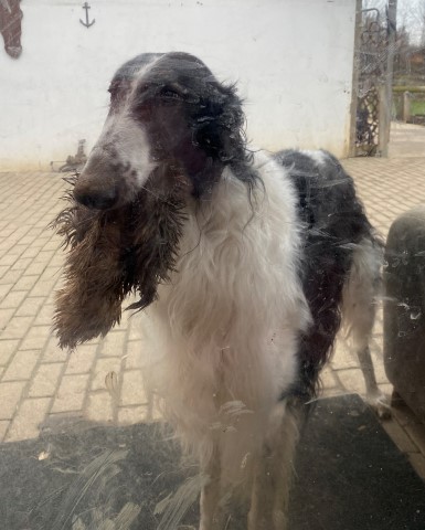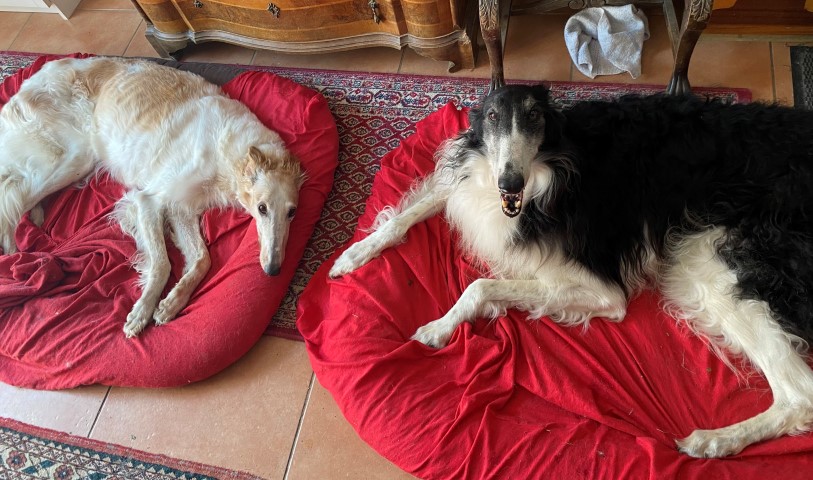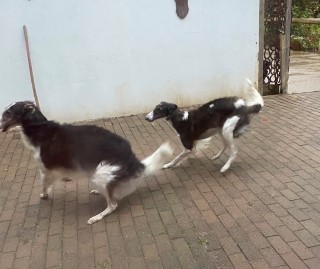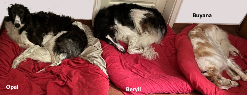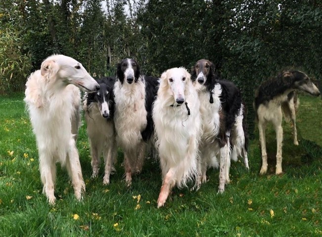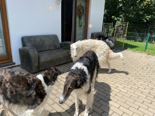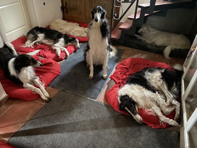 Wieder zu Hause angekommen, erwartete mich dieses Bild! 7 Barsois allein zu Haus! Was hatte ich auch erwartet bei offener Tür zur Weide und zum Paddock?