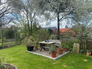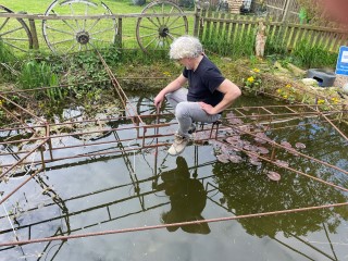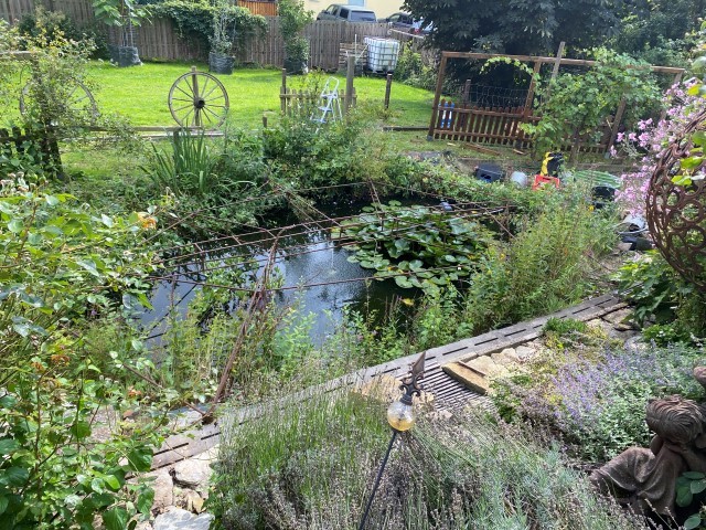 10.04.2023: Der 2. Ostertag ist angebrochen. Das Wetter ist zum verlieben, warm, läd ein, am Teich zu relaxen. Mach ich auch! Zwischendurch ein wenig Kraut zupfen. Achim will noch ein paar Fliesen legen.