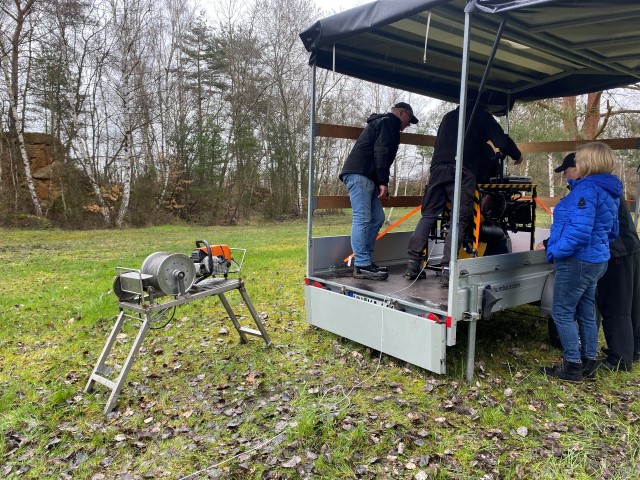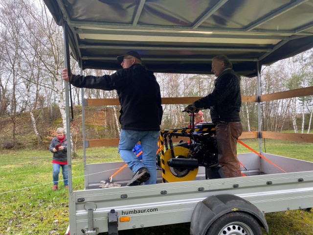Naja, das Wetter war halt April-mäßig, doch Beryll war es egal und ich hatte Gummistiefel mit. Während der Fahrt rief mich David an und fragte, wo ich denn sei. Ich: Auf der Fahrt nach Hassia. Er: Ich dachte, das ist erst morgen! Also: Hund ins Auto und auch los! Dann kam die nächste Überraschung: Von der Autobahnabfahrt gab es eine Umleitung nach Volkmarsen! Und wie es Umleitungen so an sich haben, sind sie sehr unzuverlässig ausgeschildert! Durch großen Zufall gelangte ich zur Abfahrt vor Volkmarsen und konnte von dort aus weiter über "Land" nach Volkmarsen fahren. Als ich dort ankam, war nichts los! Oh je, hatte David doch recht? Nein, ich traf auf Heidrun, Klaus und Markus, die einen neuen Teppich verlegten. Ein Stein fiel mir vom Herzen, also GsD keine Fehlinfo an David. Nach und nach kamen noch ein paar Trainingsteilnehmer. Doch es war mehr als überschaubar, das hätte ich so nicht erwartet. Dann ging es dran, den Parcours zu stecken. Ha, waren allerdings plötzlich die Jäger zugange! Also konnten wir nicht auf die Wiese! Nun, was tun? Alle Autos wurden weggefahren und der Steinbruch mußte herhalten. Das war eine super Idee! Doch dazu mußte zuerst noch ein kaputter Baum gefällt, zerlegt und weggeräumt werden.