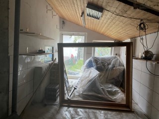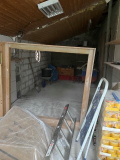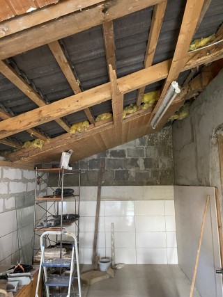 06.04.2023: Und weiter geht es mit dem Ausbau des Welpenzimmers. Da die Wand, die raus mußte, eine "tragende" war, wie sich rausstellte, mußte ein neuer Balken eingezogen werden! Der riß die Deckenvertäfelung runter! Na, danke, es hätte ja auch einfach gehen können.