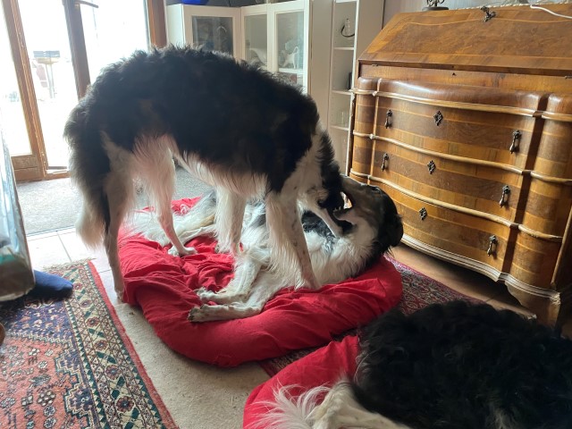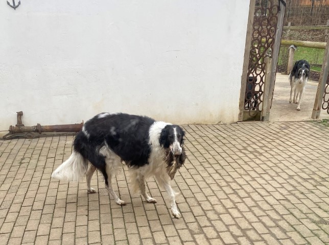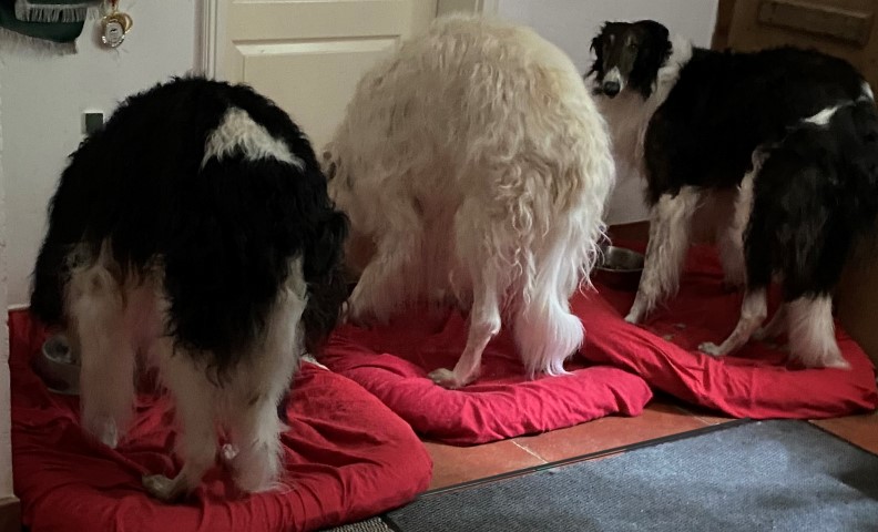 20.02.2023: Die Barsois waren dran, entwurmt zu werden! Eine große grobe Leberwurst ging dabei drauf ( zur Freude der Lieben )! In 14 Tagen noch mal, dann ist Brilliant auch mit einer Bandwurmkur dran, 3 Tage vor Abfahrt! Und dann wird reingekloppt: