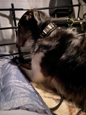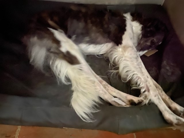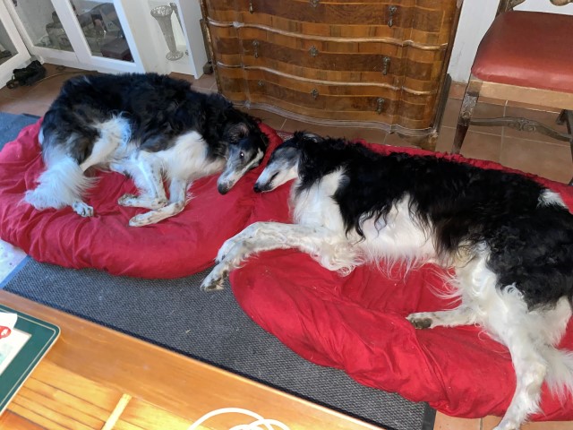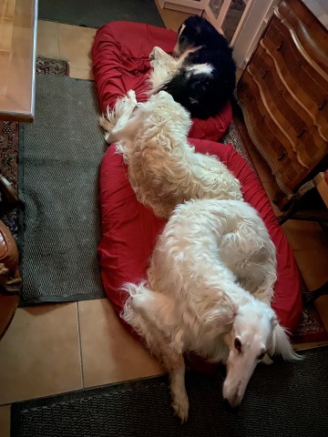 23.12.2023: Es ist früh, 00:23h und ich kann nicht schlafen! Immer noch müssen die Barsois raus und wieder rein! Ich denke an meine liebe Mam! Und 3 x am Tag muß Amethyst seine Pillen nehmen, alle 8 Stunden. Die Polizei und die Feuerwehr waren an der Brücke, weil ein Baum abgebrochen war und die Straße versperrte. Wir waren einkaufen, Hundefutter! In 3 Läden war es ausverkauft! Was ist nur los in Hundedeutschland? Wird kein Futter mehr produziert, oder wurde alles aufgekauft und gespendet, oder wo bleibt es? Im 4. Laden haben wir was bekommen, Weihnachten ist gesichert!