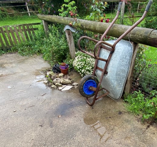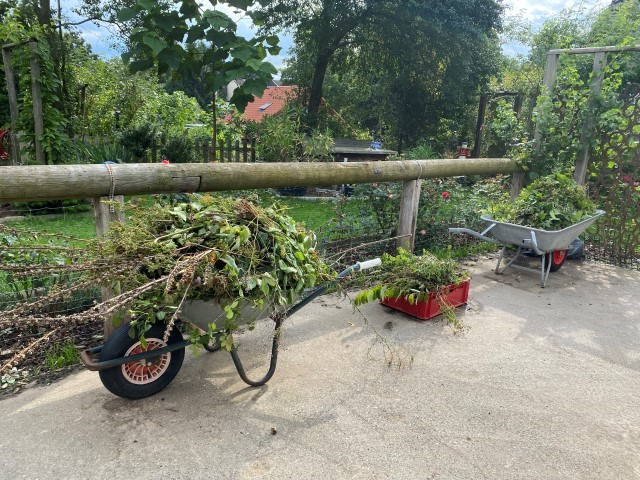 Und das habe ich entsorgt: Eine Karre Kraut und erster Rosenschnitt, ein Faß Wasserpflanzen.