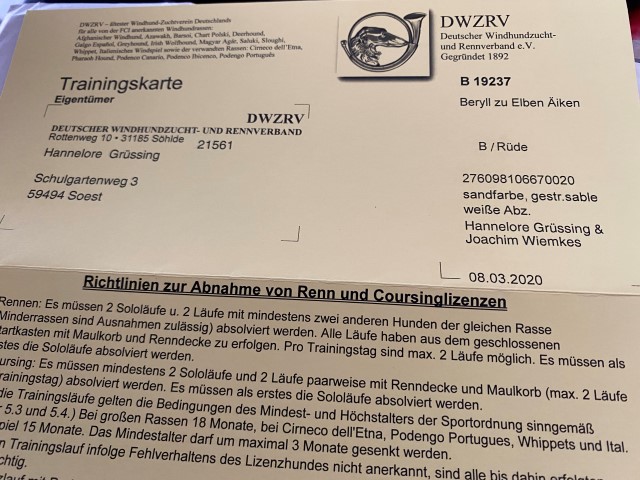 Brilliant hat die FCI-coursing-Lizenz, konnte jedoch wegen "Corona" nicht laufen, und dann, mit 4 1/2 Jahren brauchte er auch nicht mehr los!