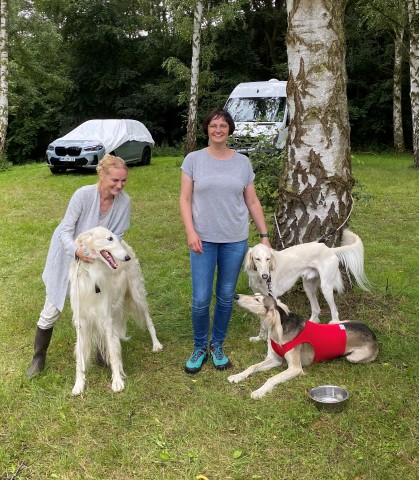 Ab 16 Uhr konnten wir endlich weg, und dann haben wir es uns mit Gin Tonic und später, nach dem Essen, mit Sekt es gemütlich gemacht, Grund zum feiern hatten wir ja: Alles gur überstanden und in der Veteranenklasse Platz 3 und 5 gemacht bei den Salukis. Am nächsten Morgen hieß es: Früh aufstehen und Heim fahren. Die Fahrt zurück, und ein letztes Abschiedsfoto, und das Versprechen, alles wieder genau so zu machen. Bis zum nächsten mal, versprochen!