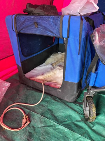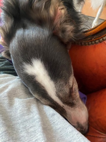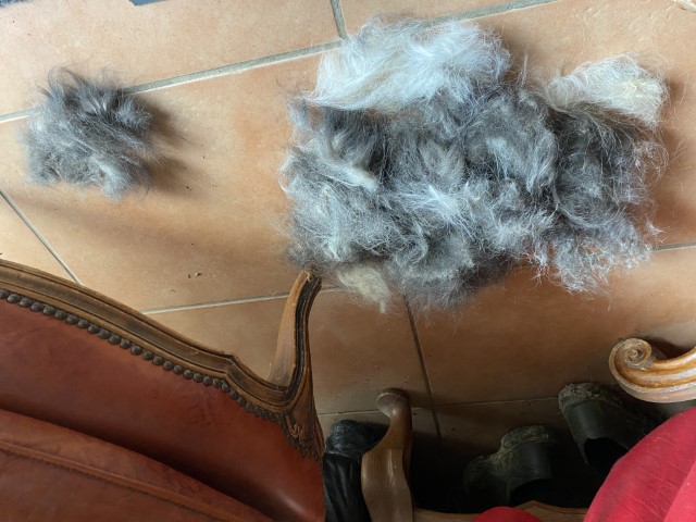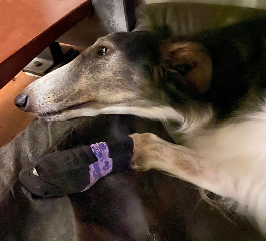 15.11.2023: Heute ist ein Tag, den keiner braucht! Beryll humpelt! Also ab zum Tierarzt. Dort wurde festgestellt, daß der Herr Sausewind sich zwischen den Ballen ein Stück Haut abgefetzt hat. Nun trägt er einen Verband. Wenn er raus will, gibt es einen Gummihandschuh darüber, damit er nicht naß wird! ich wiederhole: wenn er raus will! Und das ist gefühlt 500 mal am Tag!!!