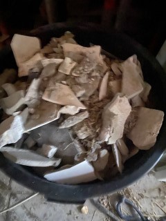 25.02.2023: Gestern ist die Wand "gefallen"! Es hat unglaublich gestaubt all die Tage, weil er ja auch flexen mußte. Und wir arbeiteten mit Atemmasken. Ich trug die Trümmer raus. Die waren richtig schwer. Das "Kleinzeug" kam in Kübel, den Rest habe ich so gestapelt. Einige Steine werden jedoch noch gebraucht.