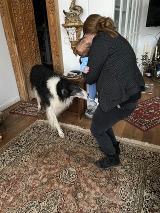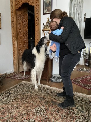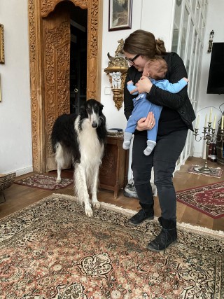 12.02.2023: Gestern hatten wir ganz lieben Besuch, Frauke und Norman waren bei uns. Und auch Jannes, gerade 12 Wochen alt. Das ist so ein süßes Baby, lacht so fein und hat keine Angst vor unseren großen Barsois, weil er das von Zuhause her kennt.