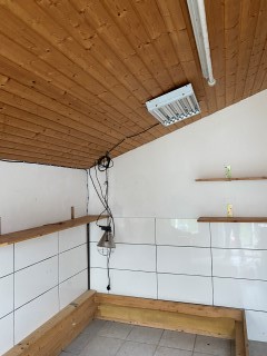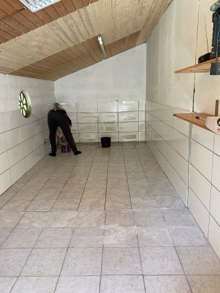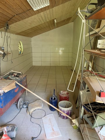 Jetzt müssen die Wände der angeschlossenen Futterkammer verputzt und gefliest und auch der Fußboden muß gefliest werden. Doch das wird erst in einer Woche passieren. Dann ist das Welpenzimmer ein sehr großer Raum mit weit mehr als die erforderlichen 15 m2.