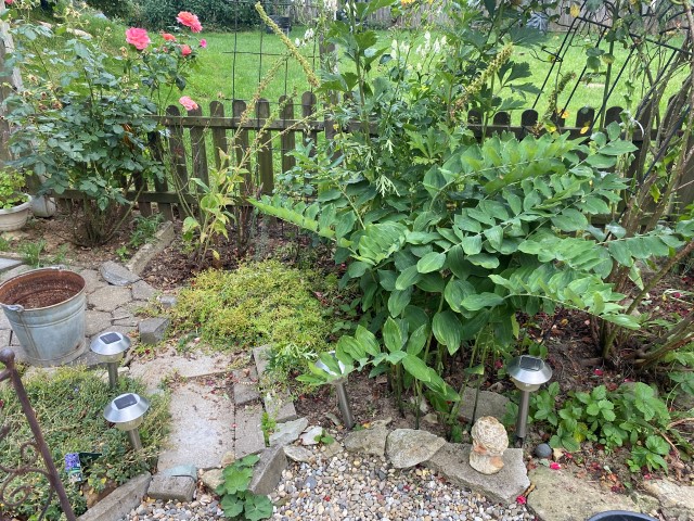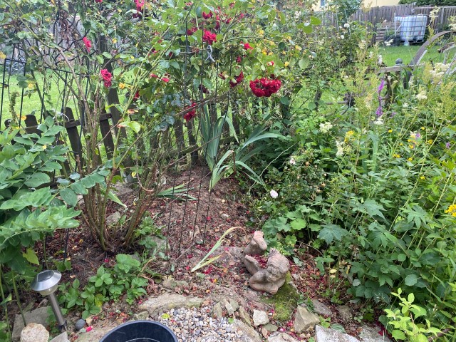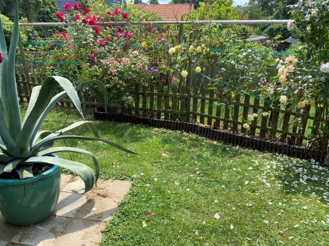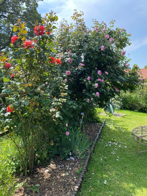 09.10.2023: Meine Arme reichen von hier bis Dortmund, so habe ich mich gequält! Die ersten 2 Rosen sind von Kraut befreit, geschnitten und dann umgepflanzt worden. Die ersten 2, und es sind 14!!! Und dann die blöde Zitronenmelisse!!! Überall hat sie sich verbreitet! Ebenso weitere unangenehme Pflanzen, wie Efeu, Storchenschnabel, Hopfen,-Horn- und Aufrechter Sauerklee, Ackerwinde und wilder Hopfen! Bergeweise was zu entsorgen!