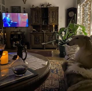 02.03.2023: Wir hatten einen schönen Abend: Renate und ich haben beschlossen, Agatha Christi`s Krimis zu schauen. Mit einem Glas Rotwein machten wir es uns - jeweils auf dem eigenen Sofa - gemütlich. So auch Brilliant, der sich uns anschloß.