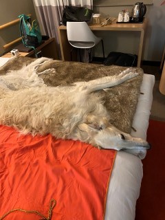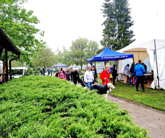 Da sitzen wir, Joyce holt gerade Kaffee, dann im Hotel, wo unsere Regenjacken ( meine und die der Hunde ) noch zum trocknen hängen. Um 19:30 h sollte die Siegerehrung sein, doch wir warteten bis 21:30 h. Endlich bekamen wir unsere Hundepässe und konnten ins Hotel zurück. Total kaputt fielen wir ins Bett. Ich konnte nicht einschlafen, hatte immer wieder Berylls Angst vor Augen, und ich schor mir, nie wieder ein coursing an einem See zu melden. Heute Morgen bin ich mit Knjaginija und Beryll ganz früh nach Hause, Achim und der Rest des Rudels warteten!