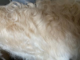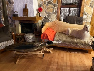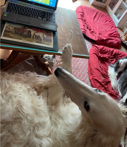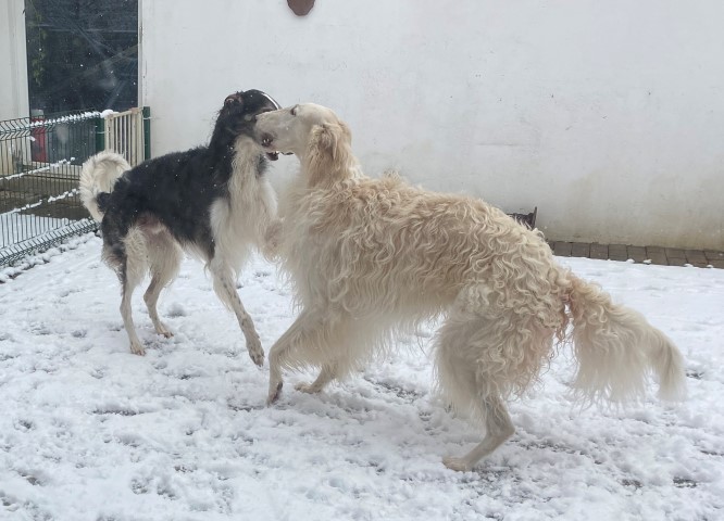 22.01,2023: Aber heute morgen traute ich meinen Augen nicht: Schnee!!! Richtiger Schnee, 4-5 cm hoch! Die Barsois wollten raus, und ich wartete im Schlafanzug frierend darauf, daß sie wieder rein kommen! Endlich trotteten sie rein, Vater Opal und Sohn Beryll hatten noch ein wenig gespielt, wie man sieht. Unsere "Veteranen" werden richtig wieder jung! Doch noch lieber spielen die beiden B`s: Brilliant und Beryll!
