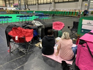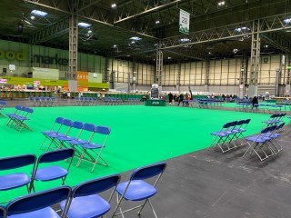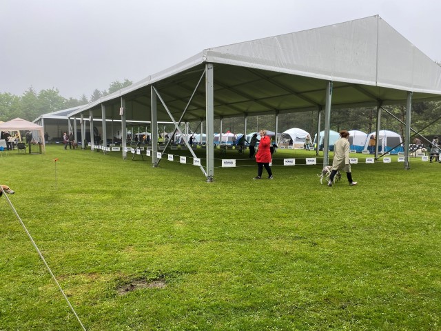 Die "benchs", in denen die Hunde untergebracht werden sollen, und unser "Barsoiring". Die Ringe waren schön groß! Wir haben es uns am Rand der Boxen gemütlich gemacht.