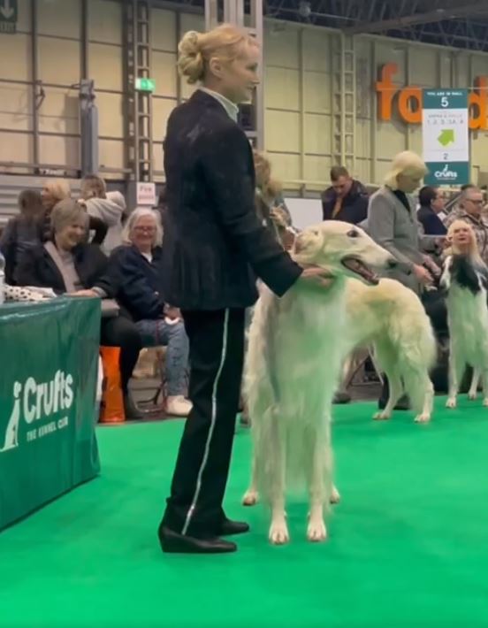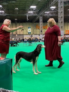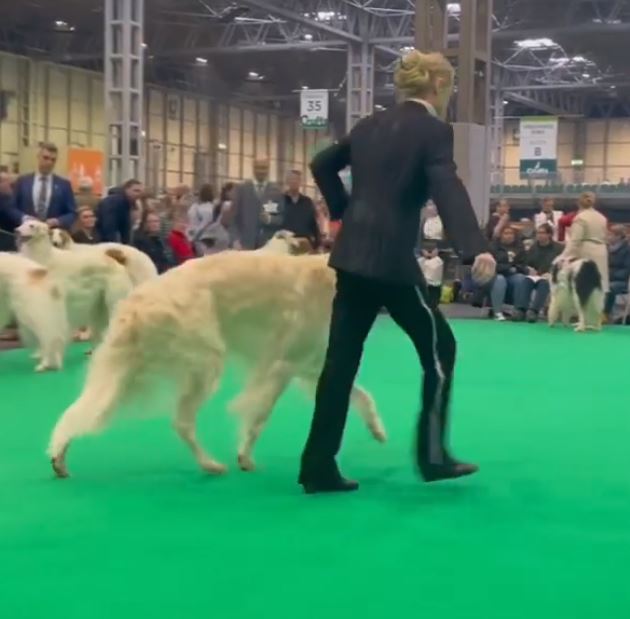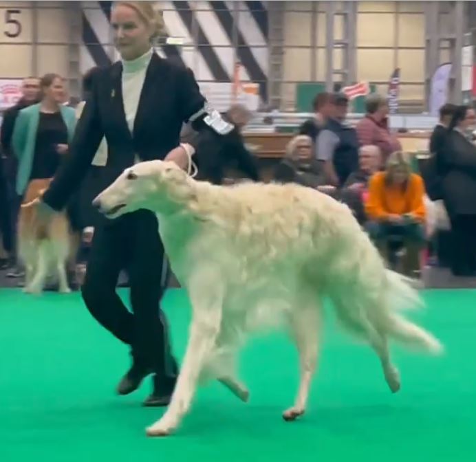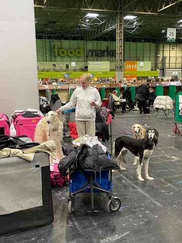 Wir mit den Barsois waren 16 in der Offenen Klasse. Brilliant hatte wohl am Morgen Flugzeugbezin getrunken. Als wir einzelnd laufen mußten, raste er derart los, so daß ich fast meinen Schuh verlor! Ich brauchte mehrere Schritte, um wieder ganz rein zu schlüpfen! Das war was!!! 5 Barsois wurden rausgesucht, das war es für uns! Immerhin unter den 16 Besten! Doch ich hatte von vorne herein nichts anderes erwartet. Interessant war, daß auf einem Video im Internet die Ringstuards zu hören waren, wie sie der Richterin ein paar Zwingernamen sagten, naja. Nachdem wir dann fertig waren, haben wir die Industrieausstellung besucht und viel gekauft!