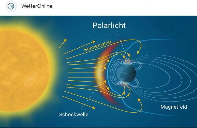 Etwa 150 Kilometer von der Erde entfernt stoßen die Elektronen des Sonnenwindes auf Moleküle der Erdatmosphäre. Dabei kommt es zu einem lebhaften Energieaustausch. Die Moleküle werden elektrisch und energetisch geladen und so zum Leuchten angeregt. Das Resultat daraus sind die Polarlichter an Nord- und Südpol. ( plane.wissen )