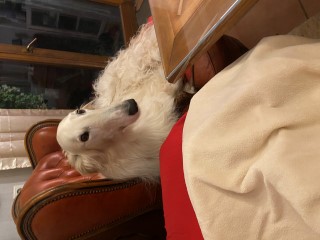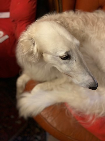 Nur wieder ein klein bißchen Kraut, dann schon wieder Regen! Die Barsois, speziell Brilliant, sitzt im Sessel. Er denkt nach!