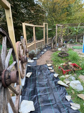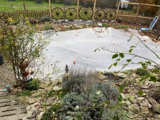 10.11.2023: Heute, bei Regen, wieder etwas im Garten gearbeitet! Das ewige Krautziehen geht mir so was auf die Nerven, außerdem will man ja nicht immer wieder den Rücken belasten! Also habe ich die Rosen und den Lavendel schön kuschelig eingepackt mit Unkrautsperrmaterial.