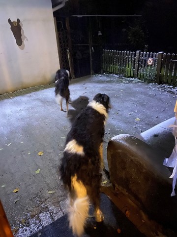 28.11.2023: Gerster Abend begann es zu schneien! Und heute morgen sauste dann eine Dachlawine von der Solaranlage runter! Hui, haben sich die Barsois erschrocken, so schnell konnte ich gar nicht filmen, wie sie weg waren!