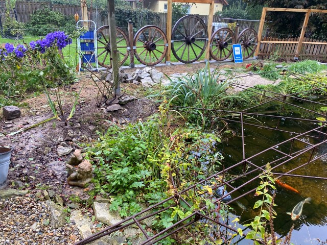 25.11.2023: Diese Woche war mit viel Arbeit verbunden! Garten, Garten, Garten! Alle Kübelpflanzen sind noch einmal umgetopft und ins "Winterquartier" umgezogen. Einige Teichhangpflanzen wurden schon umgesetzt und die Hufeisenkugel hat das Bad im Teich gut überstanden. So habe ich die Möglichkeit, die einzelnen "Pflanzterrassen" neu zu bestücken. Was mich davon etwas abschreckt, ist das Wetter.