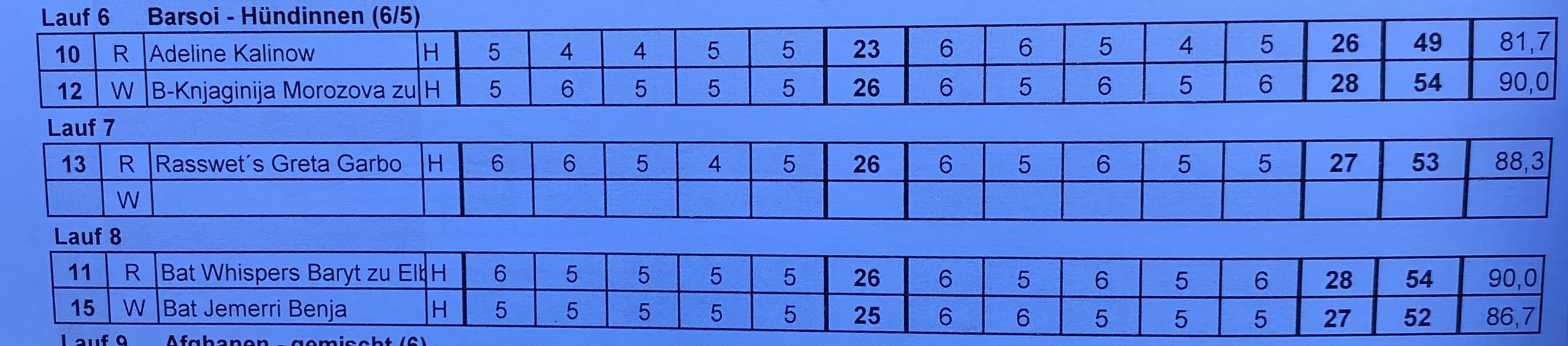 Im 2. Durchgang gab es dann das "Schwestern-Duell! Und Knjaginja verpeilten den Start, lief nach rechts statt nach links. Sie merkte es sehr schnell, und schoß im Barsoi-Affen-Zahn hinterher, dadurch überschoß sie! Dann jedoch lief alles wieder glatt! Natürlich führte das auch ein wenig zu Verwirrung bei Bat Whispers ( Honey )! Naja, so erliefen sich die beiden Platz 2 und 4! Herzlichen Glückwund an die verdiente Siegerin und allen anderen Platzierten! Siesind alle toll gelaufen und es war ein wunderschöner Tag mit Euch und vielen anderen, die man lange nicht mehr gesehen hat.