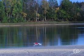 Am nächsten Morgen fuhren wir zum Ronostrand. Dort trafen wir unsere anderen Freunde. Schon bei den technischen Läufen hatten wir ein komisches Gefühl. Im Frühjahr war Beryll im See gelandet. Das war nicht schlimm, er lief im Wasser weiter, bekam jedoch Punkte abgezogen. Doch hoffentlich passiert das nicht wieder. Dann ging es mit den Barsois los, mindestens jeder 2. landete im Wasser. Doch als Beryll lief, war es ganz, ganz schlimm, er steckte im Wasser fest und konnte nicht wieder raus. Er schrie und schrie!!!! Ich startete los, mein Mitstarter rief den TA und 2 Hasenausleger fuhren mit dem Quad dahin. Ich rief und rief Beryll und war schon dabei, meine Schuhe auszuziehen, da kam er frei und konnte sich selbst an Land retten. GsD war er nicht verletzt, ich hätte heulen können vor Freude! Das alles hat dazu geführt, die Strecke umzustecken und somit zu entschärfen. Beryll durfen den 2. Durchgang laufen, denn das war nicht seine Schuld. Natürlich hatte er auf Grund der halben Strecke ganz wenig Punkte. Ich war froh, daß er den 2. Durchgang laufen durfte, er sollte ja einen positiven Eindruck zurückbekommen. Und er lief ganz toll! So hat er jetzt das letzte int. coursing für das Starten in der Gebrauchshundeklasse. Was gäbe ich darum, dieses coursing für ihn rückgängig zu machen, der Preis war mir zu hoch! ( Fotos von Ronostrand aus dem Internet ) Auch Knjaginija landete im Wasser, kam wieder raus und fand das ganz toll, spielte ihre Mitläuferin an, doch die wollte nicht spielen und so rannte zu mir. Ergebnis: Ein disq. Wie sage ich das nur David? Er wird sehr enttäuscht sein! Dann hieß es für uns alle: Warten, warten und noch mal warten!