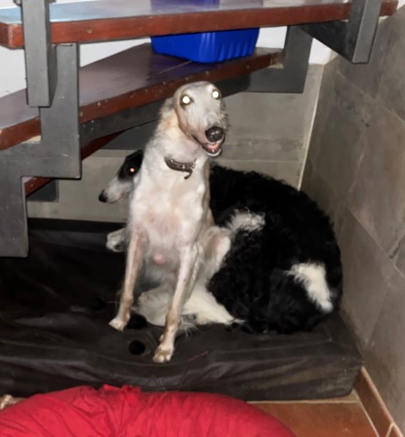 Heute Nacht ging der Rauchmelder los! Ich aus dem Bett, mit dem Besenstiehl das ruchlose Ding ausgestellt. Dabei trat ich in der Küche auf einen Knochen, den die Barsois heimlich zwischen ihren 2 Betten versteckt hatten. Das tat weh, doch ich dachte mir nichts dabei. Wieder im Bett dauerte es ca 15 Minuten, da ging der Rauchmelder erneut los, ohne Grund, ich ihn wieder ausgestellt, humpelnd. Wieder oben angekommen, stellte ich fest: Fußsohle aufgeschnitten. Also wieder runter zum desinfizieren! Der Rauchmelder meldete sich auch wieder. Die Barsois schauten lediglich verschlafen und dachten sich: Was hat die Alte nur? So versuchte ich, das Ding zu öffnen, um die Batterie raus zu nehmen. Doch das ging nicht so leicht, naja, jedenfalls kann ich jetzt nur unter Schmerzen laufen!