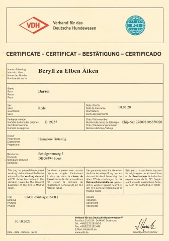 07.11.2023: Und wieder Kraut reißen! Eine große, grüne Tonne steht zur Abholung für morgen bereit! Dann geht es morgen weiter! Heute war wieder Erfreuliches im Briefkasten!!! Zu meiner großen Freude kam die Urkunde der CACIL-Prüfung für Beryll mit der Post!