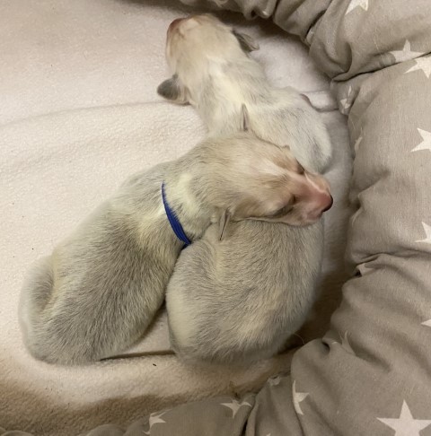 Hier liegen 2 Vertreter aus Wurf A & B. Beide sind tolle Jungs, das ist o. K.! Der eine ist dunkel, der andere hell! Der Helle hat viel, der Dunkle wenig Fell!