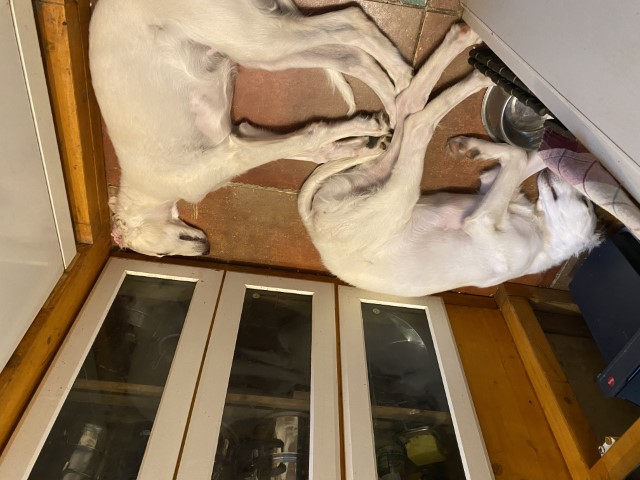16.12.2024: Die Spülmaschine pumpt nicht mehr ab! Das ist was für liebe Helfer Jürgen und Björn! Mit dem Teichsauger ausgesaugt, dann raus mit ihr! Kein Platz mehr in der kleinen Lufthansaküche!, Also mit der Sackkarre raus in den Pferdestall!Dumm nur, daß ein paar Plastikteile auf dem Boden liegen blieben. Die fand ich etwas später in Obhut der Barsois! Die Maschine geht wieder, doch diese Teile müssen nun neu gekauft werden.