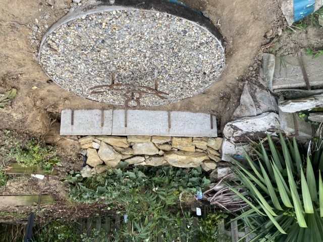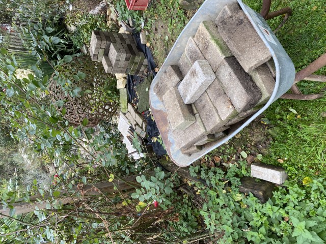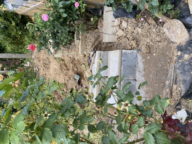 Die letzten Kantsteine werden eingegraben, und morgen will Achim einen kleinen Weg bis zur Treppe zum Rasen hin pflastern. Ich habe die Steine dafür schon aufgestapelt.