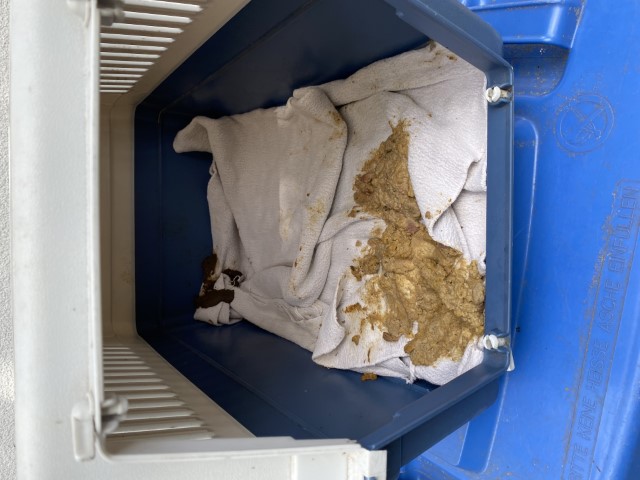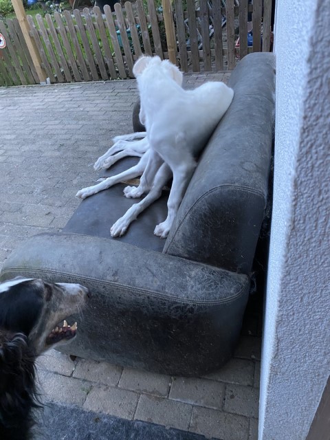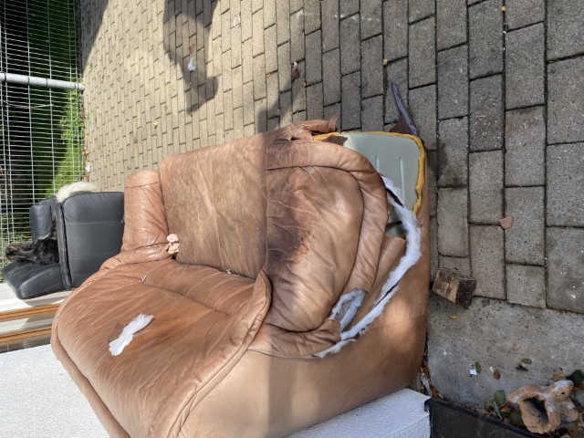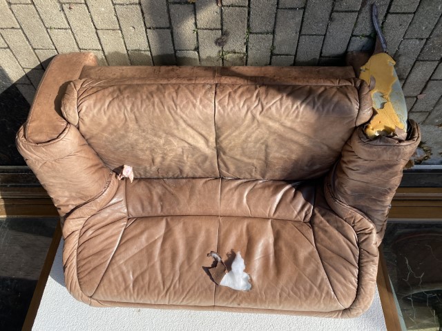 12.10.2024: Vorgestern haben wir den verbliebenen Sessel noch gegen ein weiteres 2-er Sofa ausgetauscht! Heute ist es Müllplatzreif! Und mit welcher Kraft Corund es angeht! Zieht das schwere Sofa sogar von der Wand!