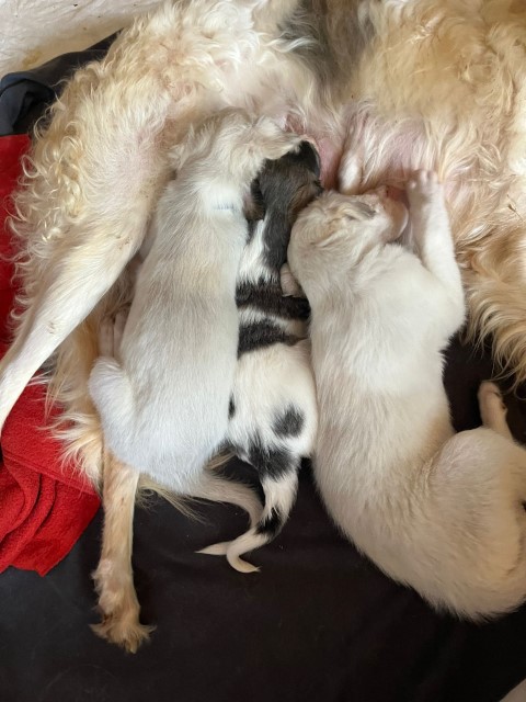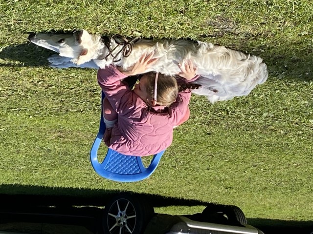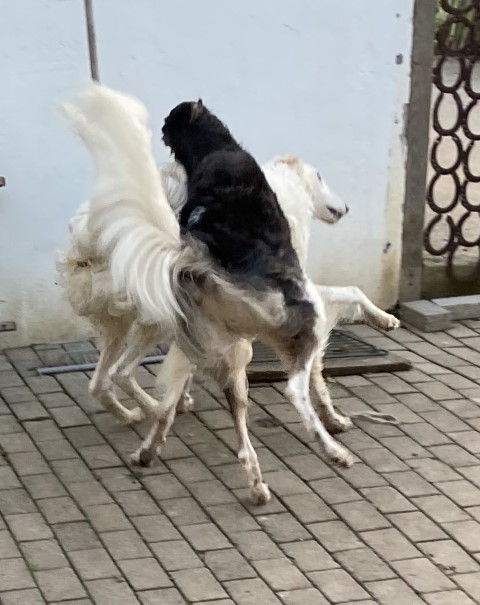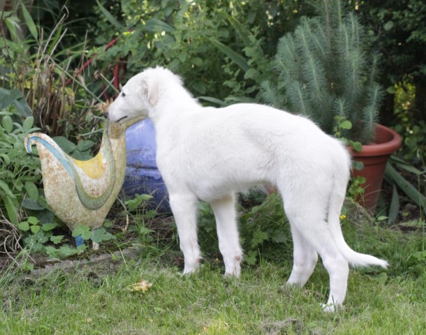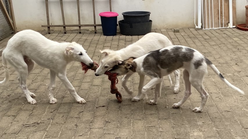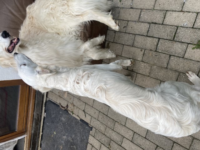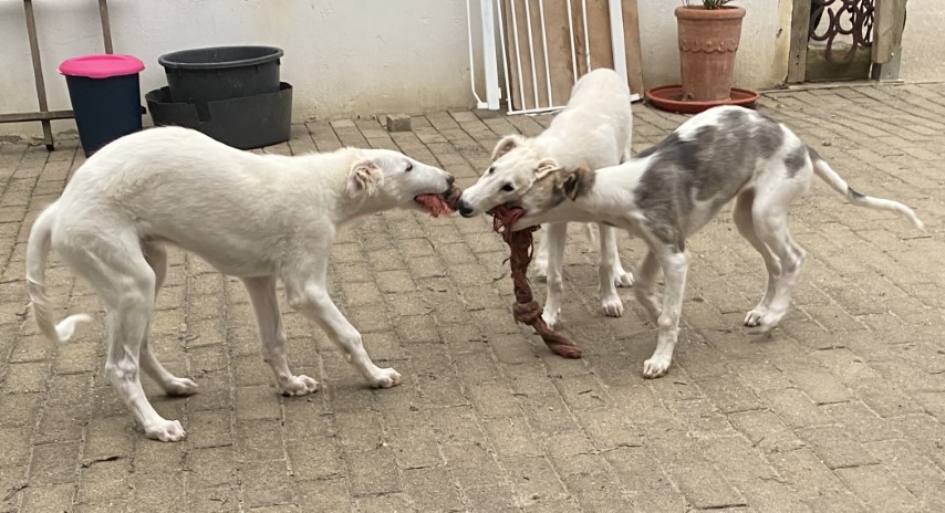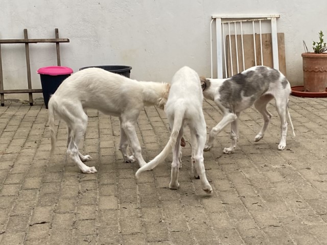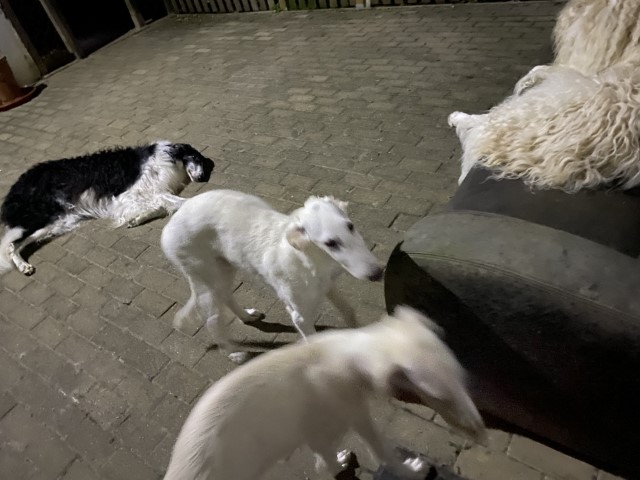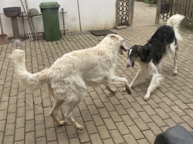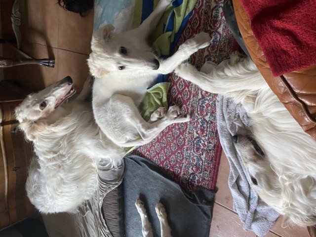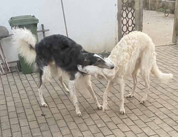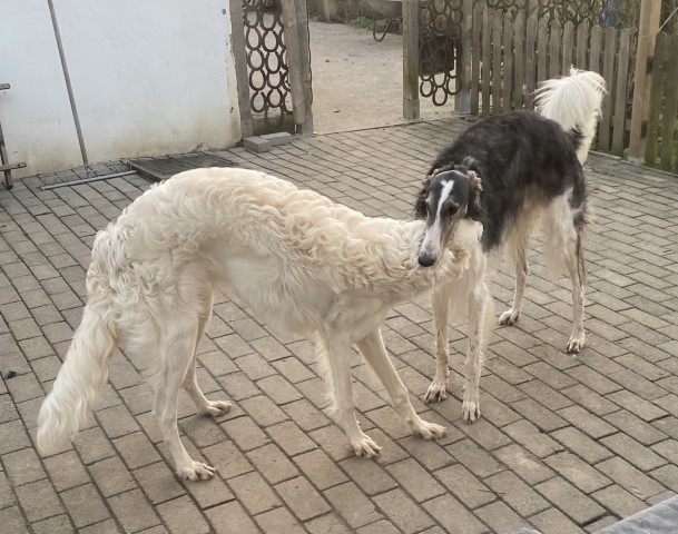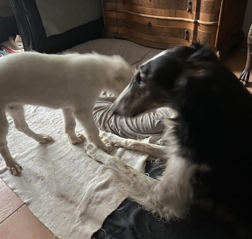 14./15.10.2024: Es ist 24:00 Uhr! Ich habe jetzt mein Geschenk von Achim geöffnet und trinke auf uns und unsere Hunde! Und auf ein paar liebe Freunde. Ich bin recht wehmütig, so "Menschen - allein". In Dinklagen hatten wir zu solchen Anlässen immer das Haus voll und feierten auf der Tenne bei den Pferden. Hier in Soest ist alles ein wenig, um nicht zu sagen, viel kleiner, die Wege sind zu weit. Ich vermisse unsere Dinklager Nachbarfreunde, unsere Familie und unsere Freunde! Es ist gerade auch hart, daß Achim an Bord mußte! Das macht so gefühlt verletzlich, hier mit den Hunden alleine zu sitzen. Doch dann erhebe ich mein Glas und sage laut: "Hart ist das Leben an der Küste, und hart sind die Frauen, die es meistern!" Danach geht es mir wieder besser, weil ich weiß, daß das wahr ist! Ich schaue unsere Barsois an und bin glücklich, daß sie mich/uns durch`s Leben begleiten! Ich hoffe, daß meine "Rentner" noch lange an meiner Seite sind, und die Jungen in die Fußstapfen ihrer Väter und Mütter treten. Und wenn nicht? Ist auch nicht schlimm, wir lieben sie trotzdem! Ich habe in meinem Arbeitsleben gezeigt, wer ich bin und was ich kann, deshalb brauche ich mich jetzt - privat - nicht mehr über unsere Hunde definieren! Die sind und bleiben Familie, und ihre Aktivitäten ein Hobby! Und das macht mich froh und auch frei! Und so gehe ich jetzt schlafen und freue mich sehr auf meinen Besuch heute Nachmittag! 14.10.2024: Ich habe alles geputzt, morgen nur noch die Fußböden in Küche und Flur wischen und die Matten austauschen, dann ist alles o. K.. Wer uns besucht, muß mit unseren Hunden rechnen, da ißt man nicht vom Fußboden, weil da nichts zu finden ist, denn: Was unten liegt, ist unseres! Nein, weil, wer unsere haarige Familie nicht akzeptiert, braucht uns nicht besuchen. 13.10.2024: Er kann es nicht lassen! Wie viel Kraft er doch im Gebiß hat! Und Papa Brilliant schaut zu! Das kleine weiße Ungeheuer!