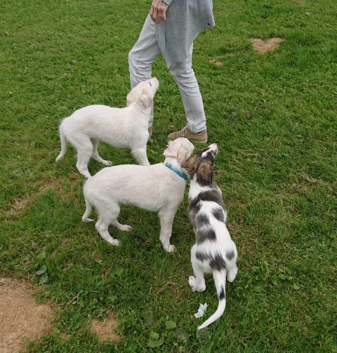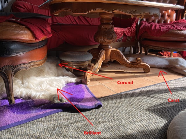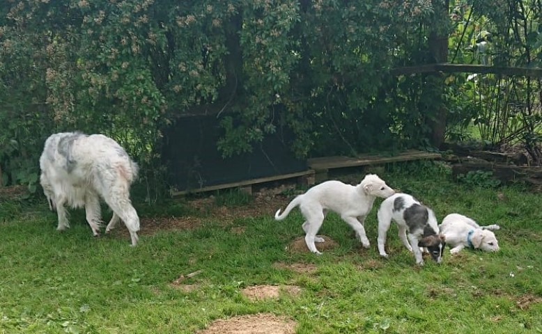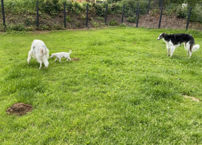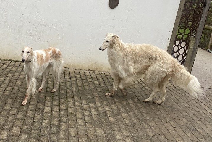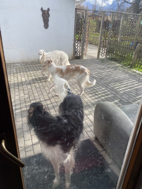 15.02.2024: Bubu ist läufig! Eine Phalanx begleitet sie seit gestern auf all ihren Wegen. Am Samstag geht sie in "Quarantäne"! Ich kann mir gut vorstellen, daß die ohnehin schon langen Barsoigesichter dann noch länger werden! Heute nachmittag hat es mal nicht geregnet, ich habe Maiglöckchen gepflanzt!