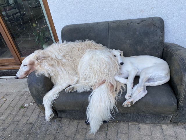 Ich werde immer wieder gefragt, was ich mache, wenn an Silvester die Böller knallen und die Hunde vor Angst fast sterben! Ich muß gestehen, ich weiß darauf keine Antwort! Ich bin so sehr froh, daß die unsrigen nicht so extrem reagieren! Viele müssen ihren Tieren Medikamente geben, damit sie die Silvesternacht überstehen, wie schade ist das! Warum muß in der heutigen Zeit nur noch so "geknallt" werden? Inzwischen weiß doch jeder, daß es für alle Tiere schlimm, sogar lebensgefährlich ist!!!! Wie viele Vögel sterben deshalb! Ist es das wirklich wert? Alle jammern wegen gestiegender Kosten, doch für solch einen Sch..ß ist immer noch Geld genug! Also kann es uns gar nicht so schlecht gehen, wie immer "geklagt" wird! Naja, das ist eine andere Geschichte! Also wieder zurück zu unseren Hunden ( und Katzen ) in der Silvesternacht. Ich kann da immer nur vermuten, da ja auch viele Angst vor Gewitter haben. Sie wissen einfach nicht, woher das kommt, denn sie können die Ursache nicht zuordnen, lokalisieren! Und vielleicht, weil wir um das Problem wissen und deshalb große Angst vor der Reaktion unserer Tiere haben, überträgt sich unsere Angst auf diese. das ist eine mögliche Erklärung. Unsere Barsois leben mit uns, und ich schaue liebend gerne Krimis! Somit ist ihnen die "Knallerei" nichts Unbekanntest! Möglich, daß beide Punkte zu einer relaxsten Situation beitragen, ich kann das nicht sagen, nur vermuten. Das "Urvertrauen", das unsere Barsois uns entgegen bringen, ist etwas, was ich hoffe, nie enttäuschen zu müssen! Wir lieben unsere haarige Familie!