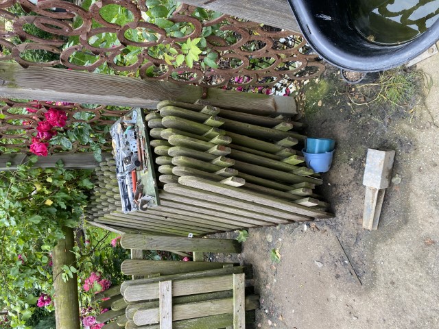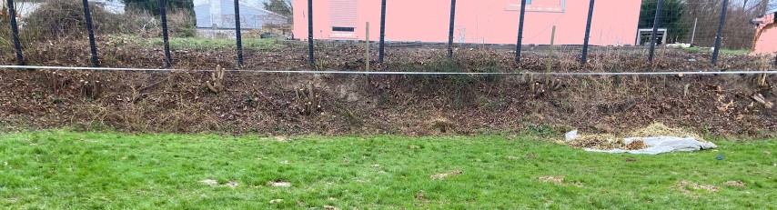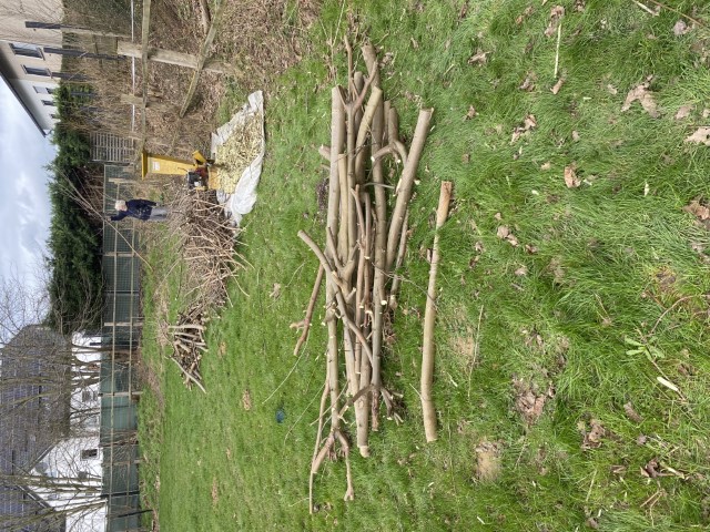 23.02.2024: Die abgeschnittene Hecke wird geschreddert und die dickeren Stämme werden gestapelt, um zu Brennholz geschnitten zu werden. Die Paddockpfosten sind raus, das Eichenholz wird sicher auch gut brennen. Ein Teil der Umzäunung kann noch verwendet werden, sehr schön!