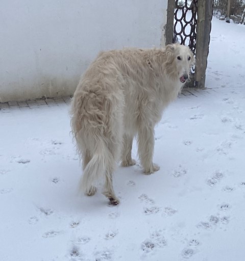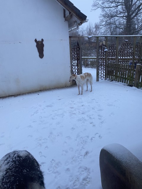 17.01.2024: Die Wettervorhersage war und ist schon arg: Eisregen und Blitzeis, extreme Glätte, Schneefall! Wir hatten bislang noch Glück! Es schnei-nieselte sich ein, und so haben auch wir eine weiße Winterlandschaft. Die Barsois hatten Spaß! Wenn sie wieder rein kamen, waren sie Schnee bedeckt!