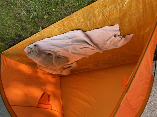 Da liegt er auf seiner Decke und denkt wahrscheinlich: Warum muß ich hier bloß sein? Ich dachte, wir fahren coursen!