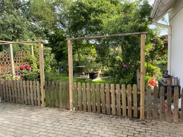 Da standen sie. Jetzt muß das Beet noch komplett neu gemacht werden, Zug um Zug! Rechts am Hang die Rosen raus, links die Rosen wieder rein, 2 Treppen bauen und schöne Sommerstauden pflanzen! Wenn alles fertig ist, ist der Sommer hoffentlich noch nicht vorbei!