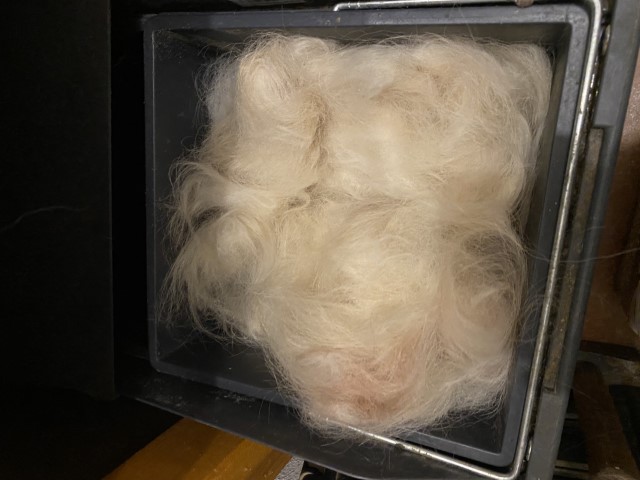 Das kleine, schwarze Stück muß jetzt noch bearbeitet werden, doch der Steinbruch hat ja noch zu! Derweil liegt unser "Schaf" gemütlich in Achims Sessel, und Beryll spielt mit Mama bis Amethyst kommt.