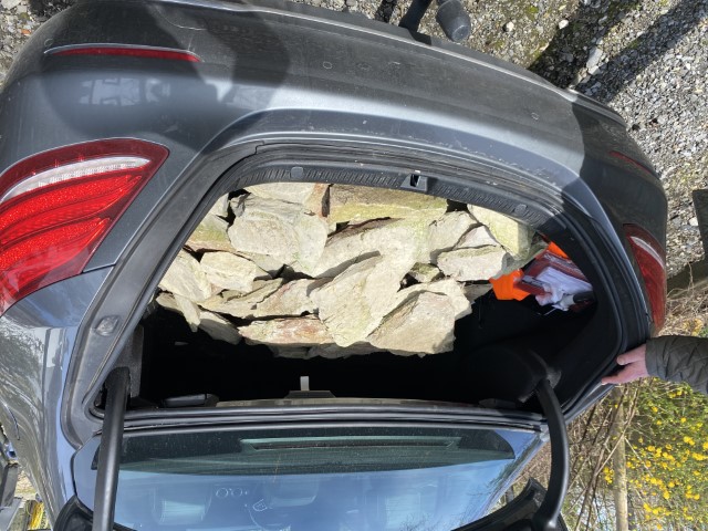 11.01.2024: Heute war es immer noch sehr kalt, doch wir besuchten "unseren" Steinbruch und packten das arme Auto mächtig voll! Morgen wird der Rest der 4. Stufe fertig gestellt! Hoffentlich klappt es mit dem Wetter!
