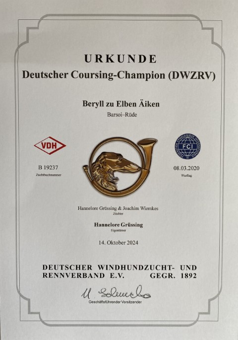 Vet.-Frühjahessieger 2022, Vet.-Europasieger 2022 DWZRV-Coursing-Ch., DWZRV-Sieger S&L 17, DWZRV-Sg. S&L 2017, LU-C, CACIL-Prüfung, FCI-coursing-Lizenz Prädikatskörung für S&L