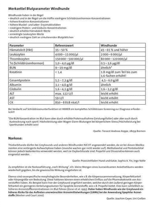 Schilddrüsenunterfunktion und medizinische Unterschiede von Hunden zu Windhunden. ![]() Hypothyreose beim Hund: Bei einer Unterfunktion der Schilddrüse werden verschiedenste Körperfunktionen betroffen sein. So z. B. das Herz-Kreislaufsystem, die Haut, der Magen-und Darmtrakt, das Nervensystem, die Augen, das Reproduktionssystem, verschiedene Stoffwechselprozesse und endokrine Regelkreise. Auch Verhaltensveränderungen können eintreten. Wie funktioniert das mit der Schilddrüse: Über das zentrale nervensystemwird im übergeordneten Zentrum Hypothalamus ( im Zwischenhirn ) TRH ( Thyreotropin-releasing Hormon ) initiiert. Das wiederum löst im übergeordneten Zentrum Hypophyse ( Hirnanhangsdrüse ) die Ausschüttung von TSH ( Thyreotropin ) aus. TSH wirkt auf die Folikelzellen der Hypophyse und aktiviert die Schilddrüse. Unter Verwendung von Jod werden die Schilddrüsenhormone gebildet, die dann in den Blutkreislauf abgegeben werden. Die häufigste Störung innerhalb dieses Regelkreises ist eine immun-bedingte Zerstörung der Hypophyse ( lymphozytäre Thyreoitis ) oder eine Atrphie, bei der die Auslöser oft unbekannt sind. Eine Unterfunktion der Schilddrüse kann in jedem Alter auftreten, meistens jedoch zwischen dem 2. und 6. Lebensjahr und entwickelt sich schleichend. Das Gewebe bleibt irreparabel geschädigt. Sie ist nicht Geschlechtsspezifisch. Die häufigsten Symptome sind: Bewegungsunlust, Schwäche, erhöhtes Schlaf-und Wärmebedürfnis, Gewichtszunahme, Fellausdünnung, trockene Haut und Juckreiz, eitrige Hautentzündungen, behandlungsresistente Ohrenentzündung, Durchfall oder Verstopfung, Verhaltensauffälligkeiten, Teilnahmslosigkeit, Fruchtbarkeitsstörungen, Man unterscheidet 4 unterschiedliche Formen von Hypothyreose: 1. Primäre: Zerstörung oder Atropie von Schilddrüsengewebe. 2. Sekundäre: Zerstörung oder Suppression der Hypophyse. 3. Tretiäre: Missbildung oder erworbene Schädigung des Hypothalamus. 4. Kongenitäre: ein angeborener Defekt ( z. B.: Störung der Jodaufnahme oder der Jodverwertung ). Diagnose: Da ein verringerter Schilddrüsenhormonspiegel auch durch äußere Einflüsse ausgelöst werden kann ( Euthyroid Sick Syndrom ( ESS ) ), sollte das unbedingt abgeklärt werden. Um die Diagnose der Hypothyreose zu stellen, sollte ein "Organprofil", daß Hinweise auf andere Erkrankungen geben kann, und ein ausführliches Schilddrüsenprofil angefertigt werden. Dabei werden T4 ( Thyroxin ), T3 ( Trijodthyroxin ), Antikörper und Cholsterol gemessen. Ggf. müssen auch Schilddrüsenfunktionstests und/oder Ultraschalluntersuchungen zur Unterstützung der Diagnose angefertigt werden. Mit erhöhtem TSH versucht der Körper den zu niedrigen T4-Wert zu steigern. Ein niedriger T4-Wert bei normalem TSH-Wert bei Windhunden kann durchaus in Ordnung sein, muß es jedoch nicht. Wenn der TSH-Wert steigt, ist es eine relevante Unterfunktion der Schilddrüse. |