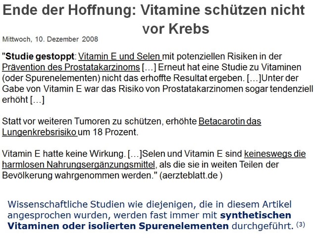 Hier ein paar Studien, die zeigen, dass künstliche Vitamine krebserregend wirken können und nicht helfen wie die natürlichen Vitamine: