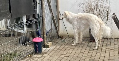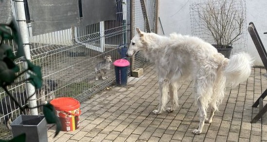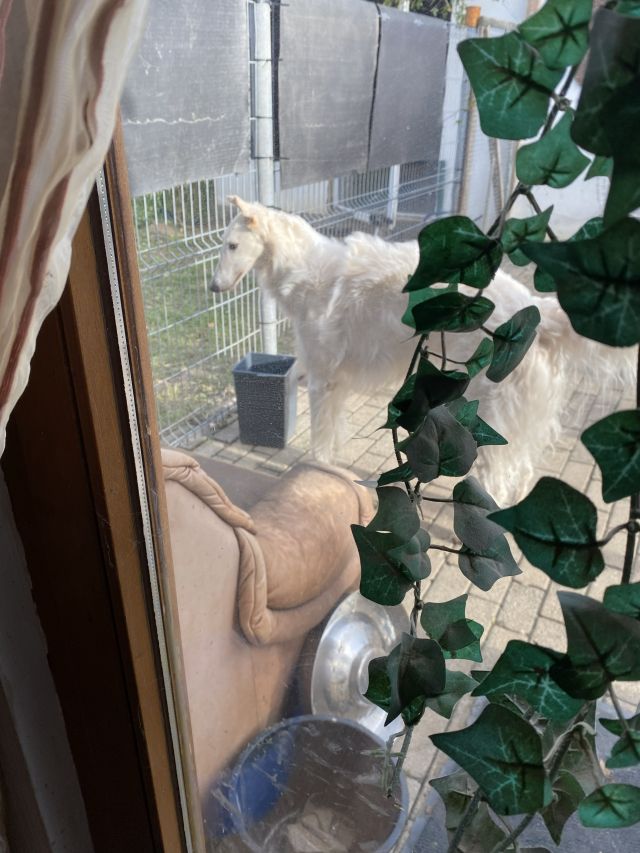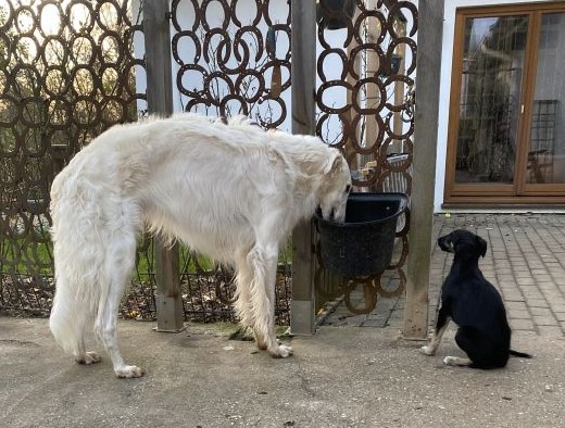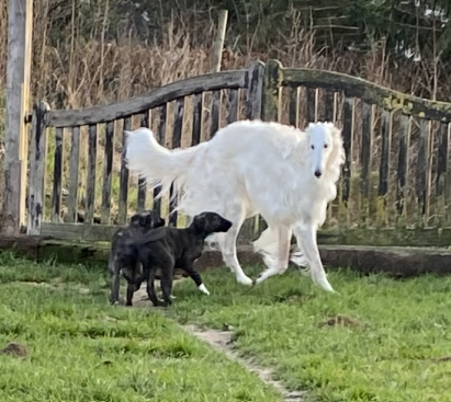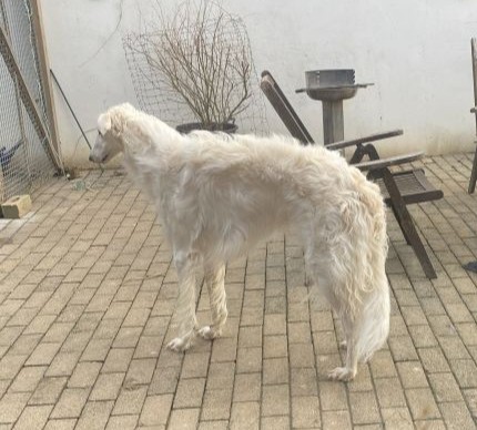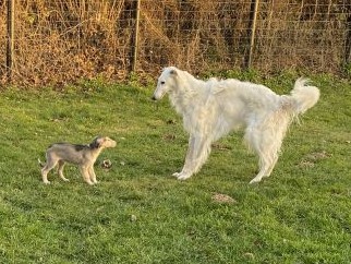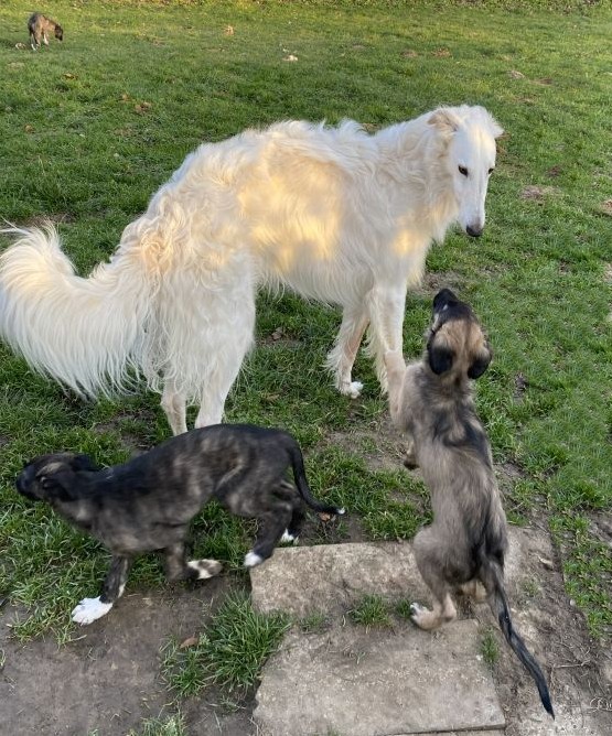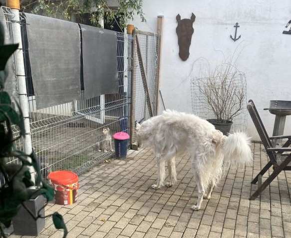 13.12.2025: Heute war wieder ein wichtiger Tag im Welpenleben: Wurfabnahme! Um 10:00h wollte Dietmar zur Wurfabnahme kommen. Das bedeutete für mich, alles muß schnell gehen, also KEINE Besen-und Schrubberspielchen mit den Welpen, was sie so gerne machen. Und wenn man schnell sein will, macht man Fehler! 1. Corund war nicht im Haus, 2. das Welpengehegetor war nur angelehnt. Und dann kam Corund aus dem Paddock zurück, das kleine Volk sah ihn und schwupps, alle durch das Tor: Corund begrüßen! Corund in voller Panik: "Was wollen die denn von mir? Nix wie weg!!!" Und dann ging die "Barsoischwanz-Jagd" los. Oh Heimat, bis ich die dann endlich alle wieder hatte!!! Der arme Corund! Er tat mir soooo leid! Doch das kommt davon, wenn man immer vor dem Zaun steht und die Kleiden anspielt.