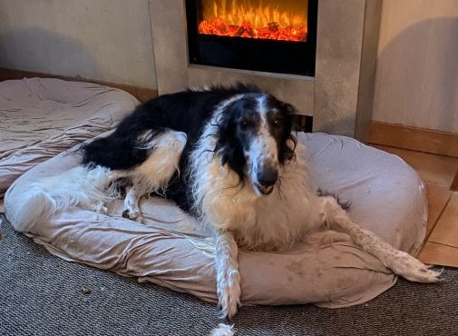 Heute ist Opal sehr artig, es werden keine Katzen mehr gejagt, lieber liegt er warm vorm Kamin und erwartet ein Leckerlie!