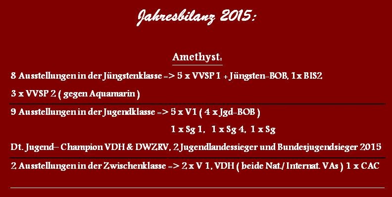 3 x Pl. 4 5 x nicht in der Ch.-Klasse ausgestellt: 5 x V1, 4 x CAC, 1 x Res.-CACIB (Amethyst hat sozusagen seine Championtitel in 2017 noch einmal gemacht!!)