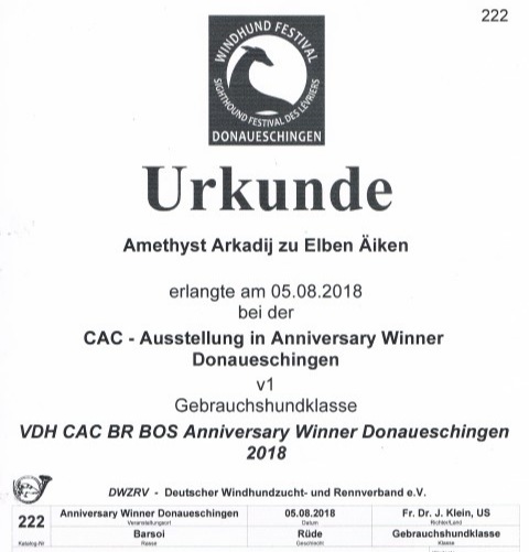 davon waren 2 Veranstellungen Landessieger-Ausstellungen, deren Titel er gewann und 1 mal die Veranstaltung "Sighthound of the Year", an der er in 3 von 4 Disziplinen nominiert war und das Zuchtziel des DWZRV: Schönheit und Leistung für sich gewann. In Donaueschingen holte er sich den Titel Anniversary Winner Donaueschingen 2018. 6 x 1. Platz, 2 x V3