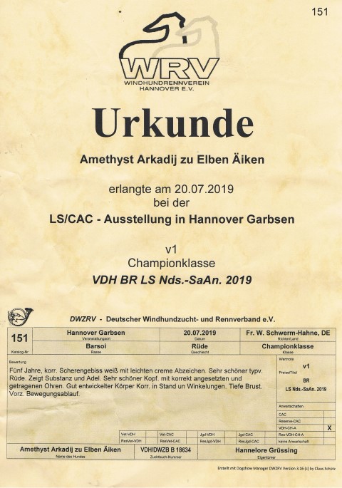 ![]() Verbandssieger, BOB und DWZRV-Sieger-BIS! Landessieger Niedersachsen-Sachsen-Anhalt 2019 ![]() Rangliste Ausstellung 2018: Mit sehr wenigen Ausstellungen auf Platz 3! DWZRV-Sieger S&L 2018, Ranglistengewinner Coursing 2017, Ranglistengewinner Ausstellung 2016, Sighthound of the Year 2017 in Schönheit und Leistung ( das Zuchtziel des DWZRV ) V1, VDH, CAC, Anniversary Winner Donaueschingen 2018, BOS aus der Gebrauchshundeklasse heraus!
